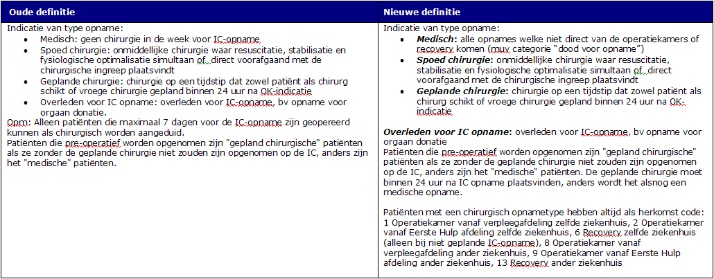 In overleg met de deelnemers en in overeenstemming met de internationale literatuur wordt per 1 januari 2012 de definitie van het veld opnametype gewijzigd. De eis van een operatie in de week voor IC opname voor de optie “chirurgisch” is hierbij komen te vervallen.